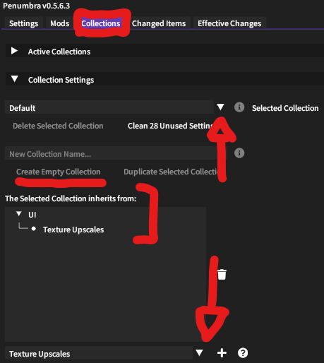 In the bracketed area you can see an example structure, where my Default collection (my main character) inherits from the UI collection, which in turn inherits from the Textures collection.