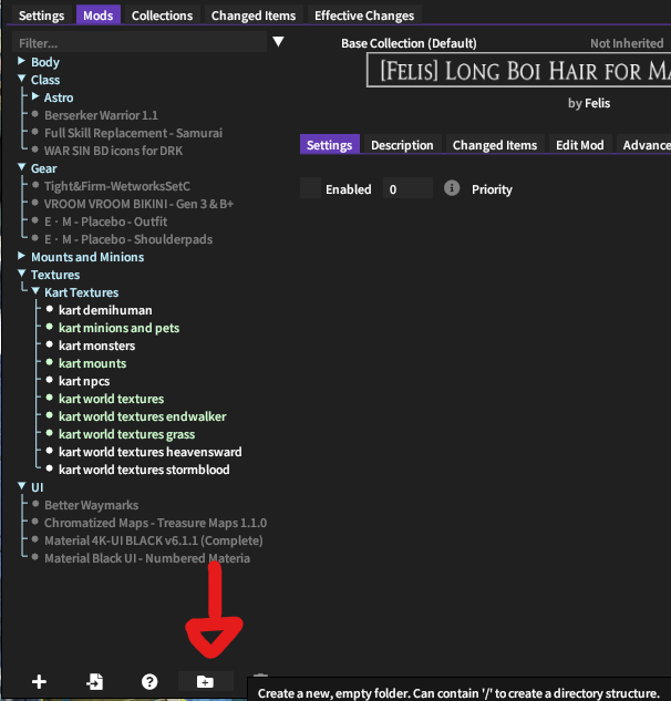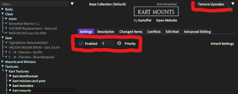You can also see from the picture that in this case I have a priority on the mod of 7. This is used for de-conflicting mods that overwrite each other. In this case the mounts texture mod should overwrite the little data that it shares with the minion texture mod, so I set it to have a higher priority.